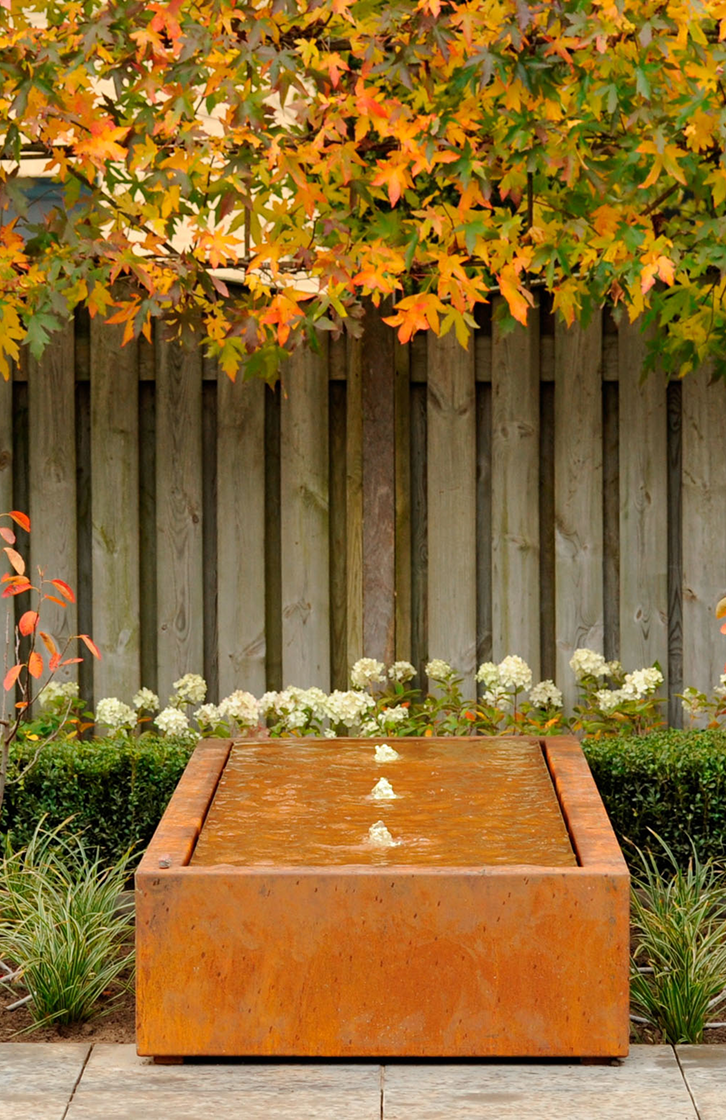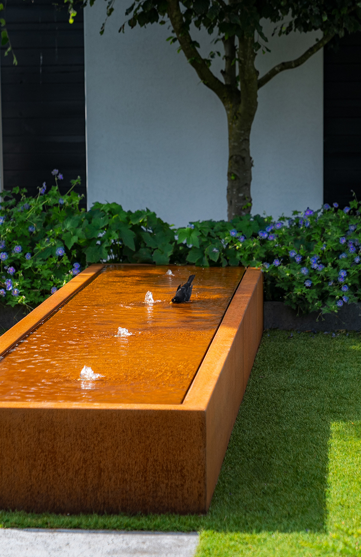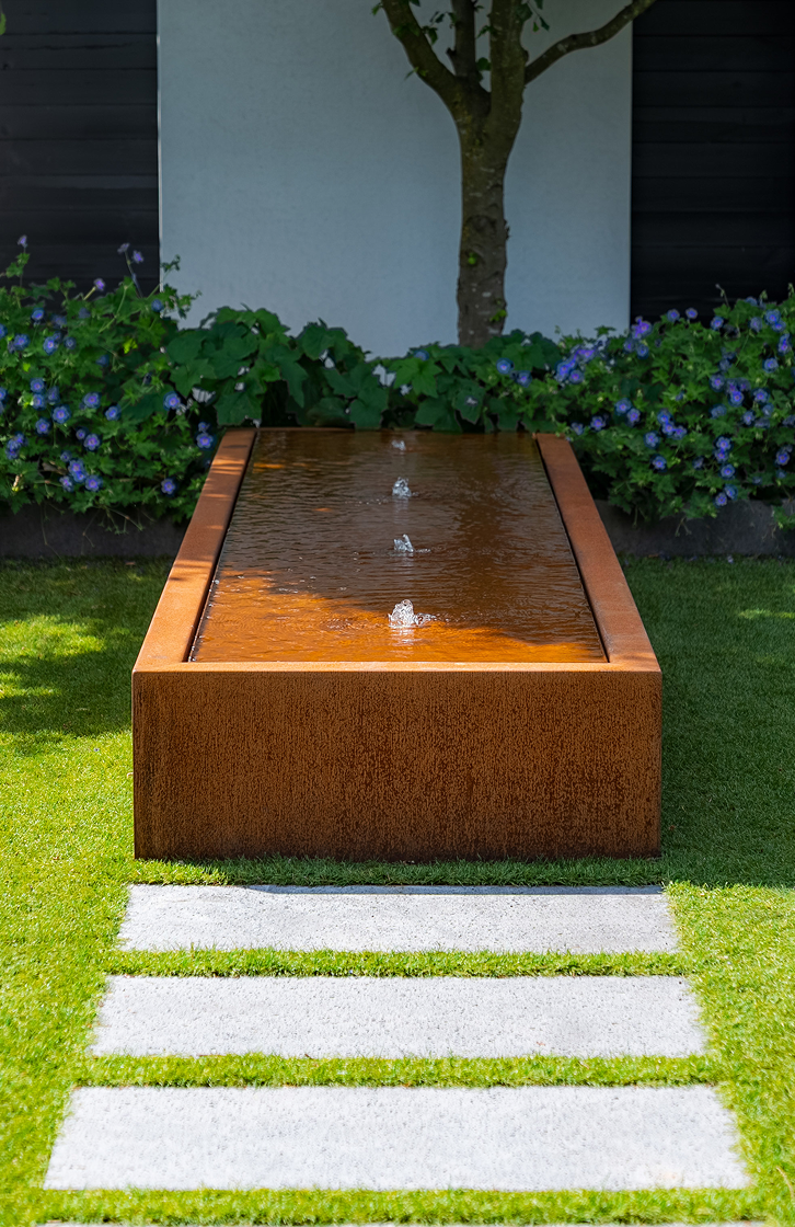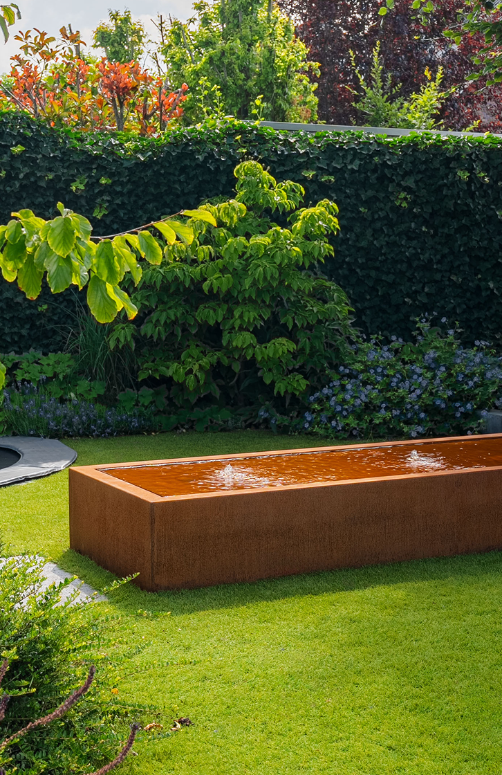 Nasze stoły wodne to wyraziste i stylowe ozdoby ogrodowe. Ich kanciaste linie dodają stylu i dynamizmu przestrzeniom ogrodowym. Ten wykonany ze stali kortenowskiej stół wodny będzie wyglądał pięknie wśród bujnej zieleni każdego ogrodu. Wszystkie nasze stoły wodne zawierają w standardzie pompę i fontanny podświetlane diodami LED. Możesz więc cieszyć się tym wodotryskiem także w nocy!
