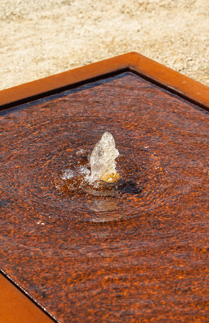 Stół wodny ze stali corten wymaga regularnej konserwacji. Stół wodny należy całkowicie opróżnić co 3 miesiące, dokładnie wyczyścić i napełnić czystą wodą. Zapobiega to uszkodzeniom spowodowanym np. przez rdzę. Ponadto należy regularnie sprawdzać wartość pH. Powinna ona być neutralna (7).